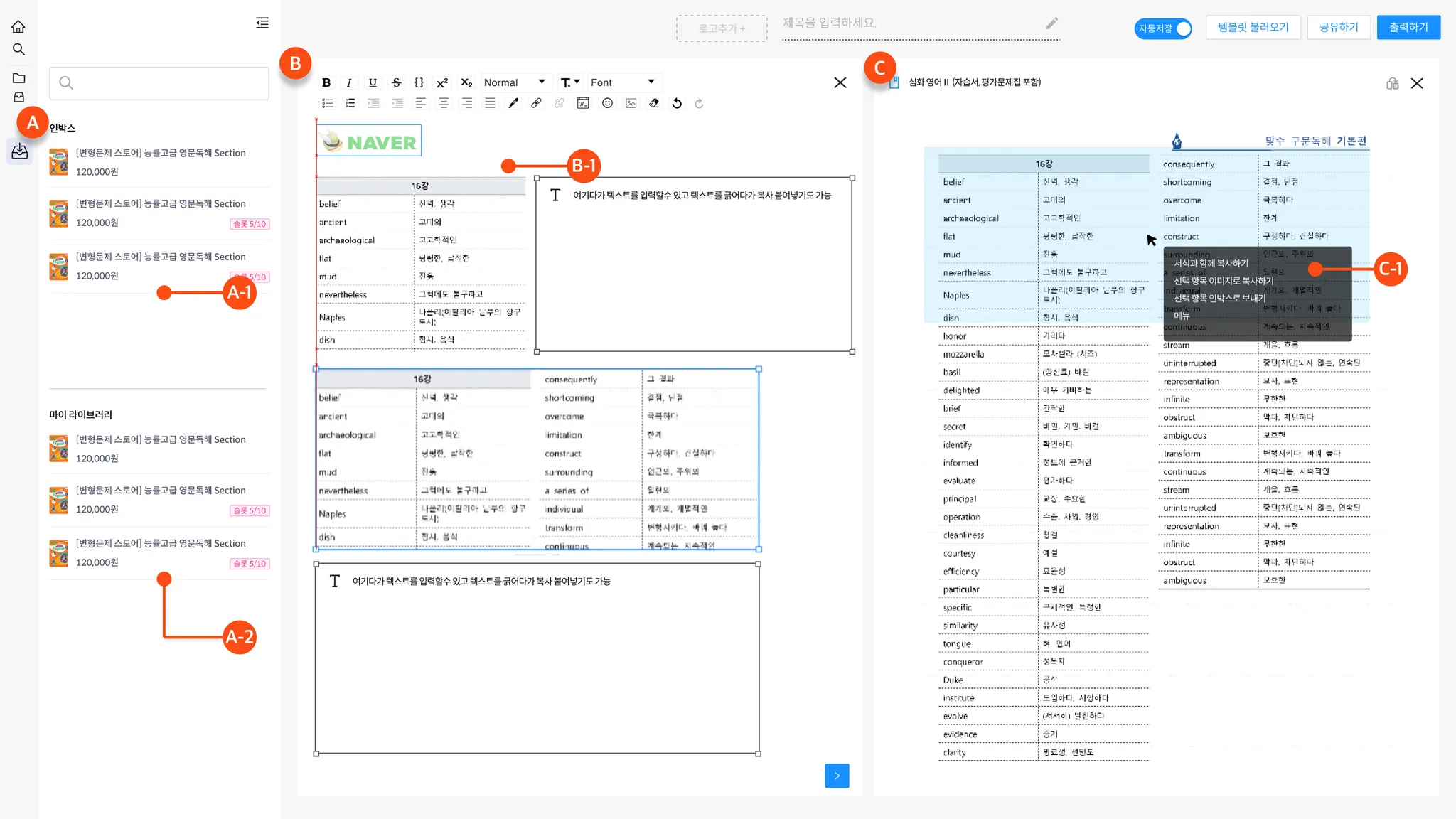B-1 : A 영역의 자료를 클릭해 로드, 단어, 문장, 문단, 문제 범위로 발췌 가능