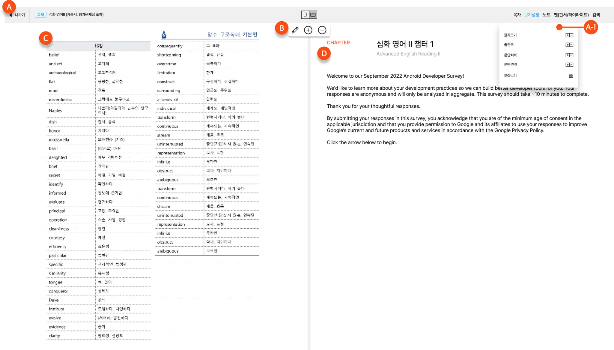 A-1 : 목차, 보기 설정, 노트, 펜등의 메뉴 지원