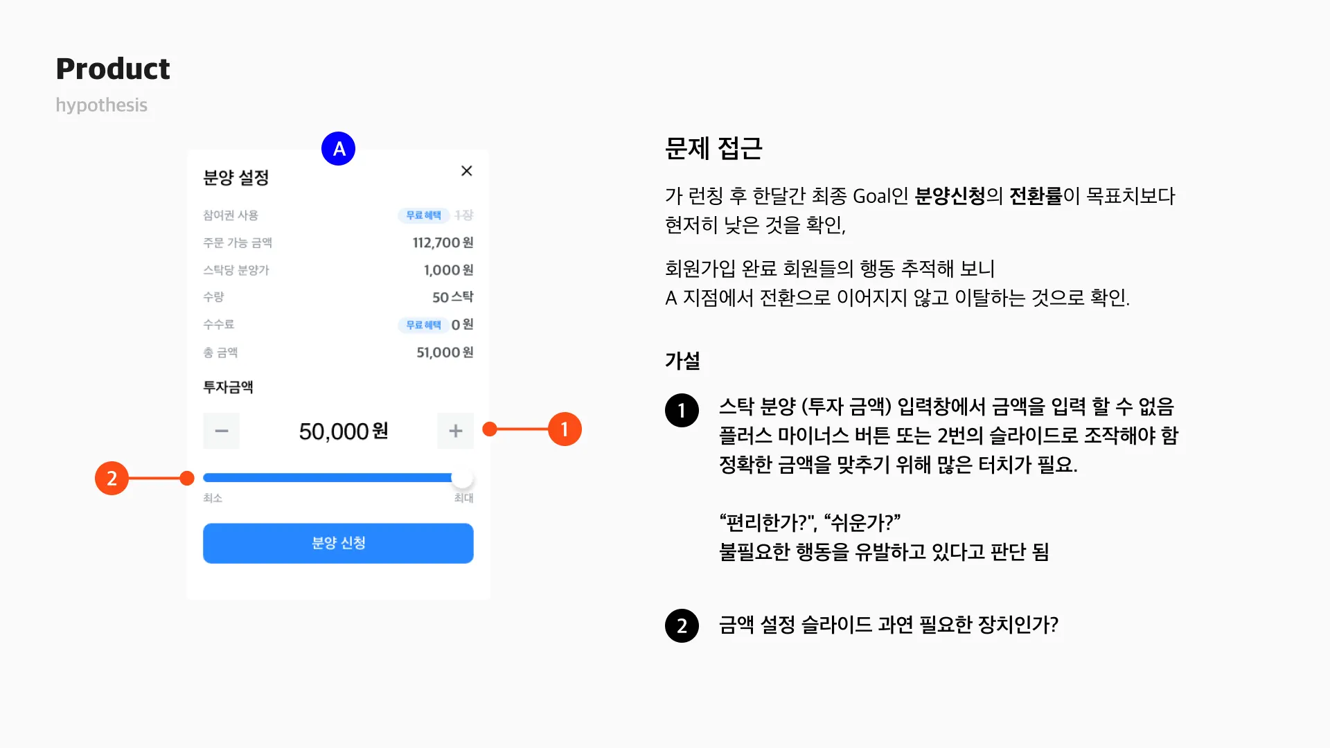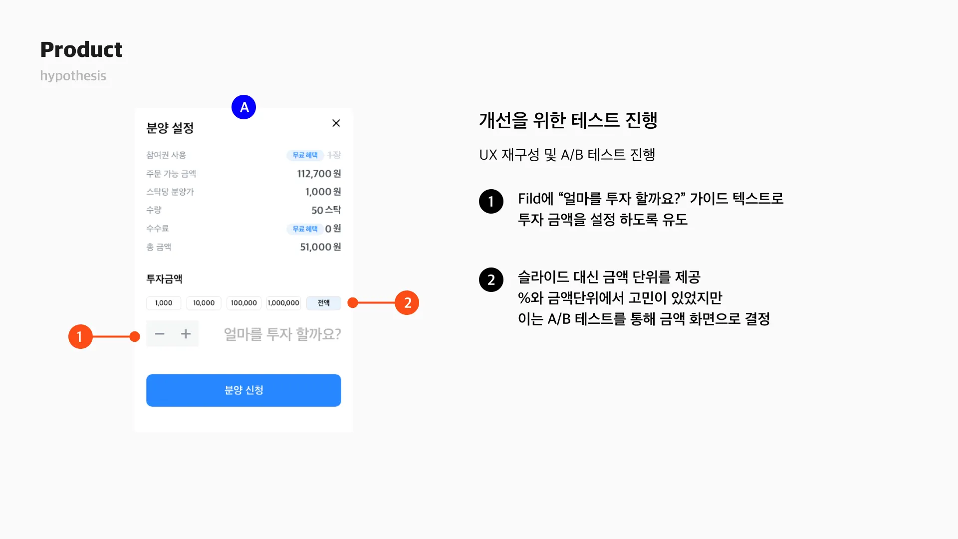 대체 투자 상품에 대한 거부감 또는 생소함을 완화 시키는 방법으로 사용자가 10만 원대 소액 투자로 대체 투자 상품에서 수익을 경험하게 된다면, 부동산 투자로도 자연스럽게 연결될 수 있을 것이라는 가설을 세웠습니다.