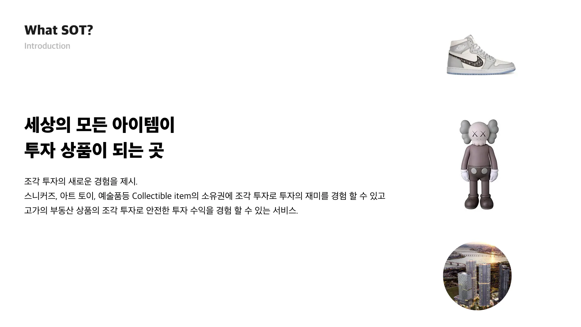 Stock Of Things는 디지털 자산 거래 플랫폼으로, 사용자들이 스니커즈, 예술품, 아트토이, 부동산 등의 대체 투자 상품에 소액으로 투자할 수 있는 조각 투자 서비스를 제공합니다.