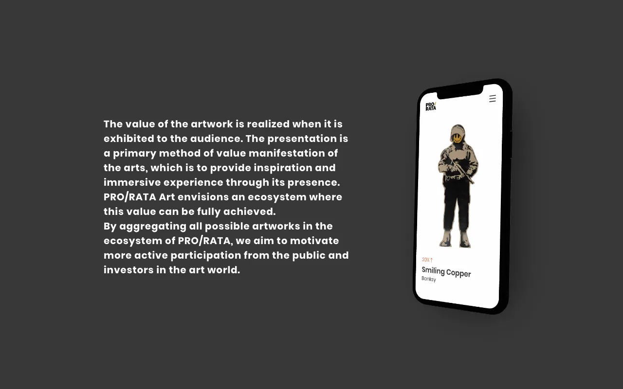 "프로라타 아트"는 금융 및 법률 용어인 "프로라타(Pro Rata)"를 미술품에 적용한 개념으로, 원하는 만큼 미술품을 구매하고 소유할 수 있게 하는 분할 소유 권을 발행하는 것입니다. 이는 미술품 시장에서의 새로운 형태의 소유 방식으로, 투자자들이 작품의 전체 가치 중 일부에 해당하는 소유권을 갖는 것을 의미합니다. 이를 통해 작품의 소유와 관련된 비용을 분산시킬 수 있어 미술품 시장에 새로운 참여 방식을 제공합니다.